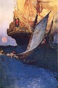 was an American illustrator and writer, primarily of books for young audiences. A native of Wilmington, Delaware, he spent the last year of his life in Florence, Italy. In 1894 he began teaching illustration at the Drexel Institute of Art, Science and Industry (now Drexel University), and after 1900 he founded his own school of art and illustration called the Howard Pyle School of Illustration Art. The term the Brandywine School was later applied to the illustration artists and Wyeth family artists of the Brandywine region by Pitz (later called the Brandywine School). Some of his more famous students were Olive Rush, N. C. Wyeth, Frank Schoonover, Elenore Abbott, and Jessie Willcox Smith. His 1883 classic The Merry Adventures of Robin Hood remains in print to this day, and his other books, frequently with medieval European settings, include a four-volume set on King Arthur that cemented his reputation. He wrote an original work, Otto of the Silver Hand, in 1888. He also illustrated historical and adventure stories for periodicals such as Harper's Weekly and St. Nicholas Magazine. An Attack on a Galleon nn08