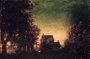 Moonlight, 1885, the Brooklyn MuseumIn 1877 Blakelock married Cora Rebecca Bailey; they had nine children. In art, Blakelock was a genius, yet, in business dealings and in monetary transactions he proved a failure. He found it difficult, if not crushing to maintain and support his wife and children. In desperation he found himself selling his paintings for extremely low prices, far beneath their known worth. In hopes of lifting his family from abject poverty, reportedly on the day his 9th child was born, Blakelock had offered a painting to a collector for $1000. The collector made a counter offer and after refusing the proposed sum Blakelock found himself in a bitter argument with his wife. After the domestic dispute, Blakelock returned to the patron and sold the painting for a much lesser sum. Defeated and frustrated, it is said he broke down and tore the cash into pieces. And so it was after such repeated failed business transactions that he began to suffer from extreme depression and eventually show symptoms of mental frailty. In 1899 he suffered a breakdown. Farmhouse of F.B. Guest ca. 1868(1868)